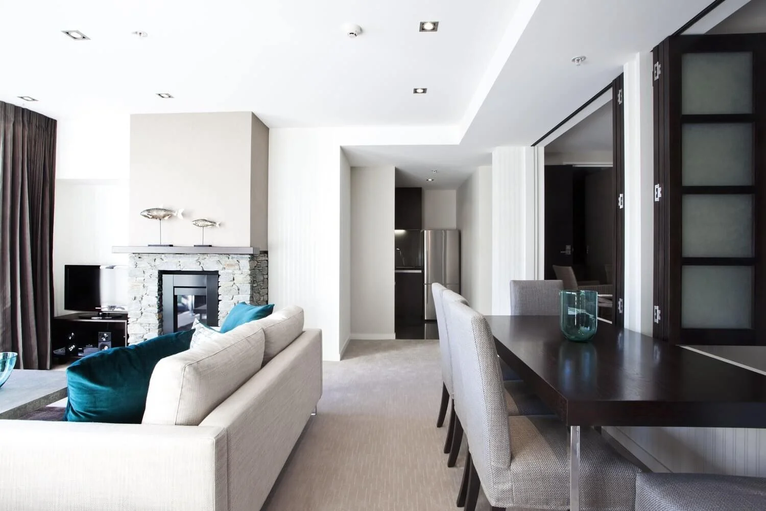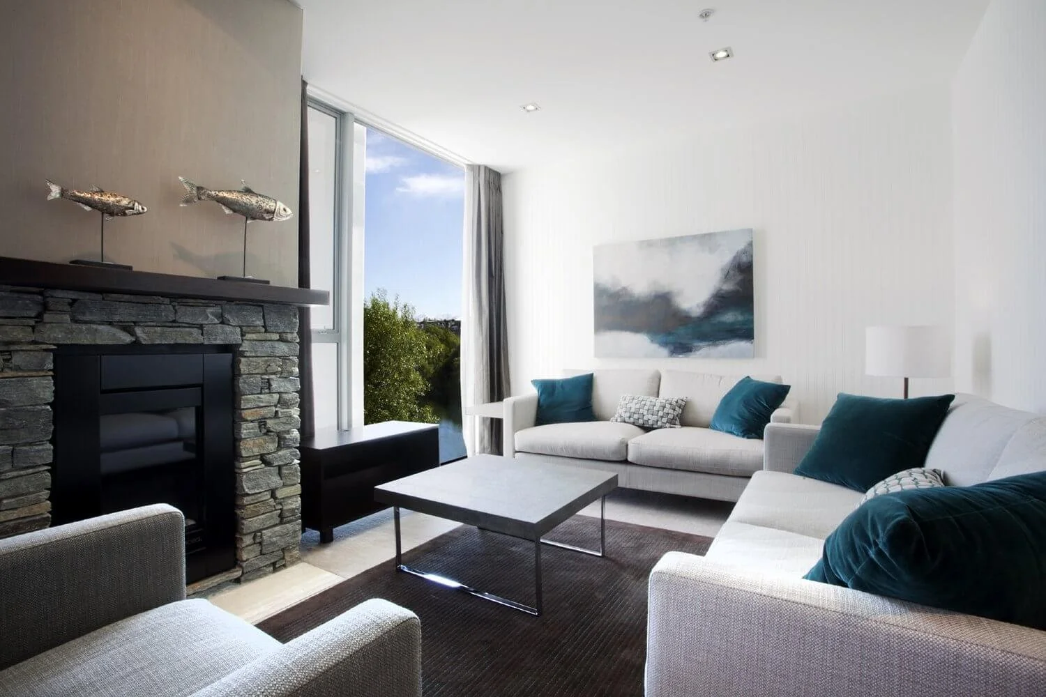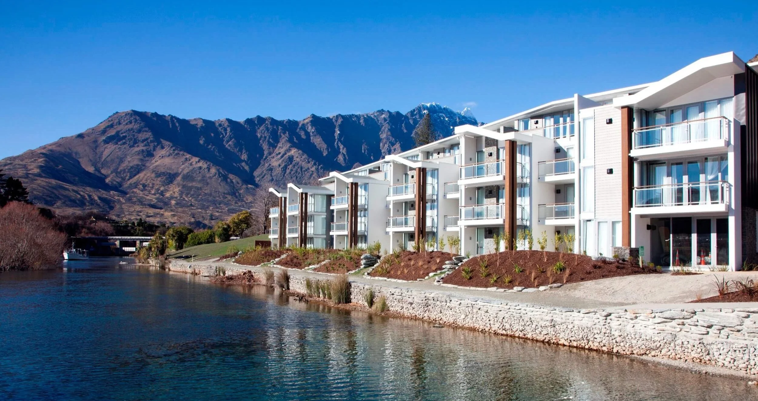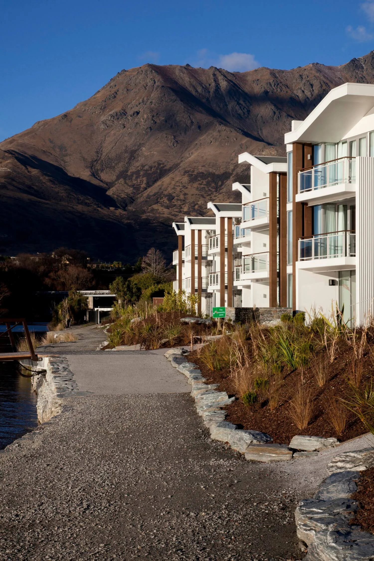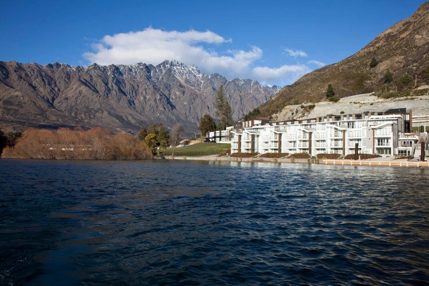 Part of a larger Kawarau Falls Station lakefront resort complex, the Lakeside West Apartments link underground to the adjacent Hilton Hotel, situated north-facing shore of picturesque Lake Wakatipu.