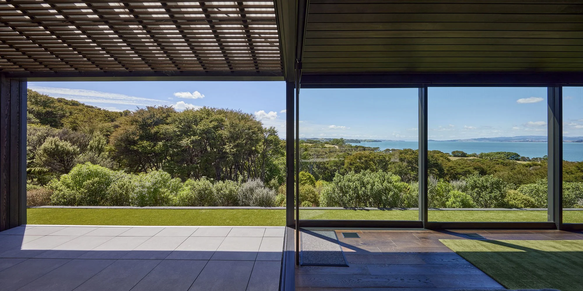 The site sits to the east of a short spit of land which is a short drive from Matitia. It looks out over the ocean past Whakanewha Regional Park and to the Coromandel ranges in the distance. The whole peninsula was cleared for farming approximately a century ago and then redeveloped for residential use in the 1980s. Much of the peninsula has first generation regrowth of kanuka and manuka trees and some second generation forest growth is just starting to establish. The owners spent two years clearing the site of gorse and other weeds before building commenced.