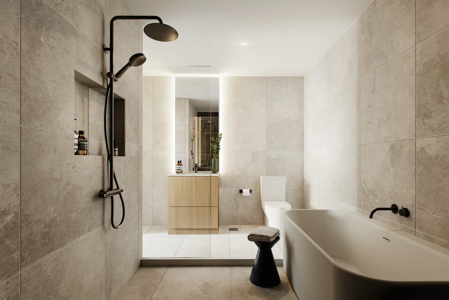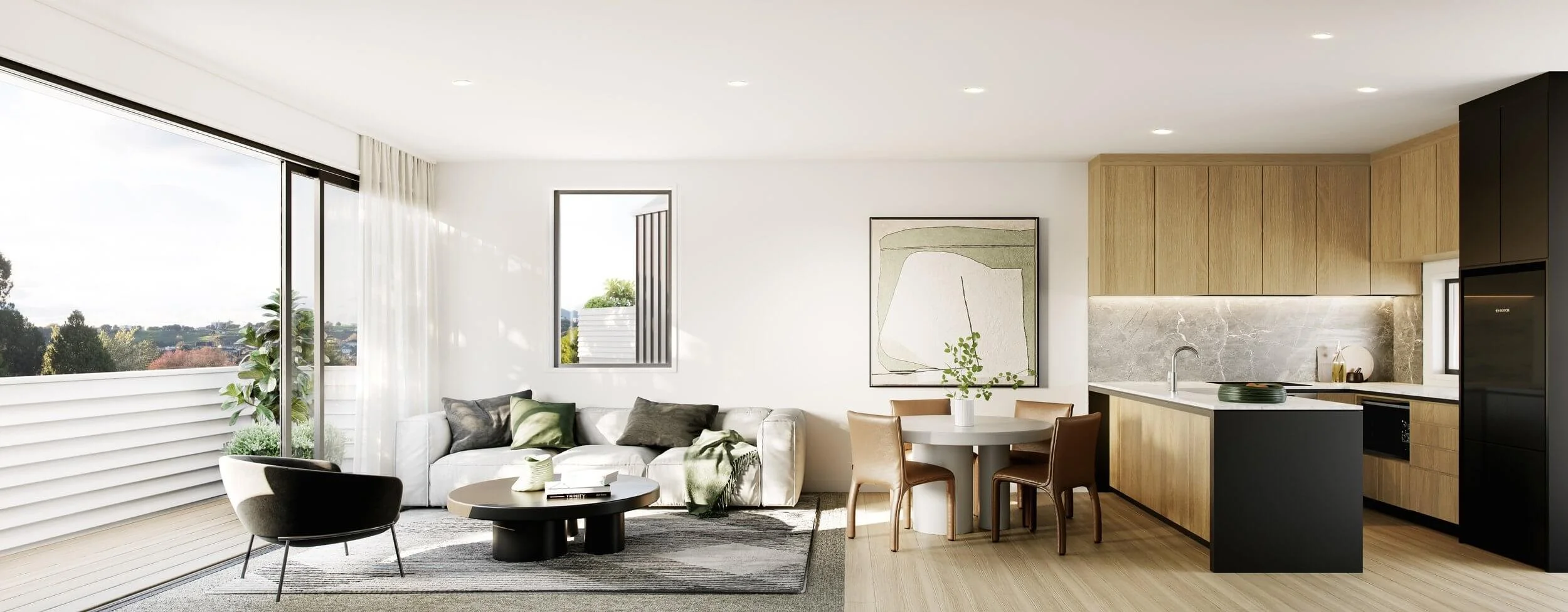 Diverse dwellings of one to three-bedroom apartments and three to four-bedroom terraced homes offer greater consideration for the changing family unit and diverse needs of an ageing population. Ground-level apartments feature extended outdoor living, where occupants can open up and extend the private outdoor area into a larger landscape. Upper-level balconies and terraces balance privacy with passive surveillance through the use of large glass balustrades offering residents vistas of Orakei Basin and nearby West Reserve.