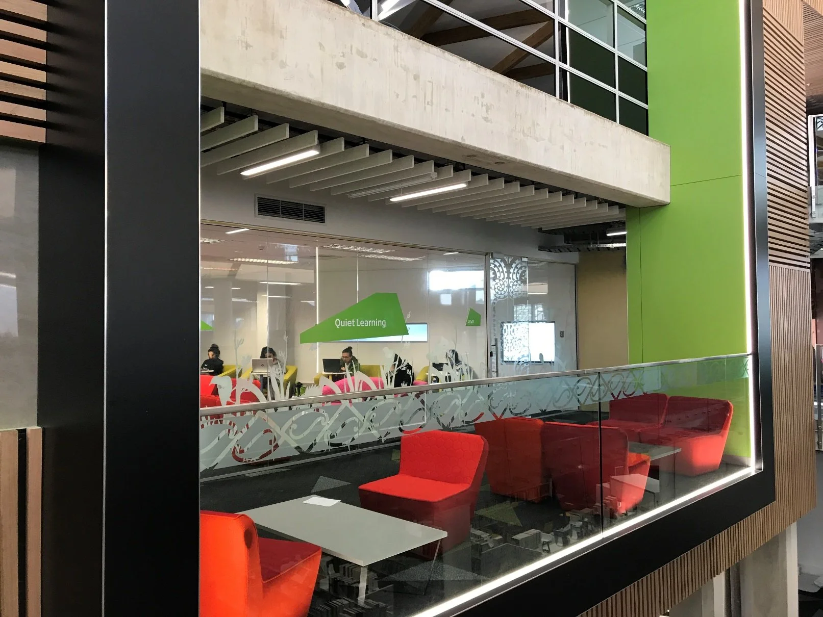 The brief was for a large open-plan social commons designed to simultaneously fulfil roles as a library, a social gathering space, a learning environment where students will collaborate and learn from each other, a café and food service space, and a space where a range of student support services would be provided. A visually stimulating interior with a strongly Pacifica flavour was required.